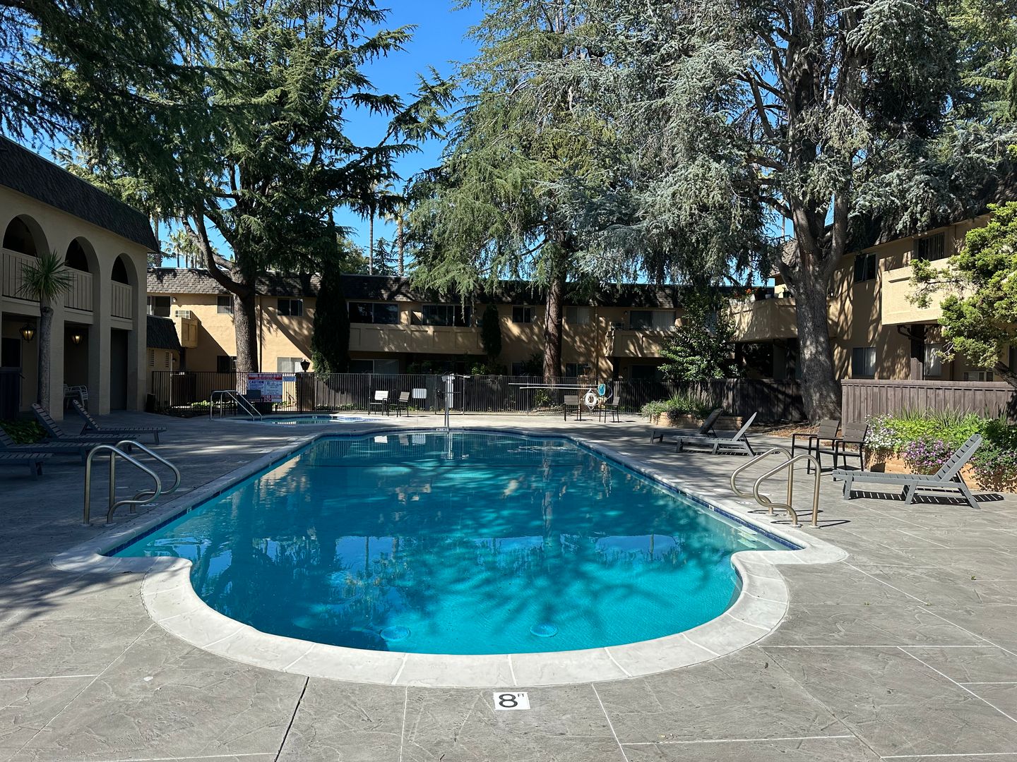 Spacious two bedroom, two bath, downstairs residence featuring a generous living room, dining area, kitchen, enhanced with easy-to-care-for vinyl flooring, adding practicality and aesthetic appeal to the space and a spacious patio. The kitchen has elegant quartz countertops, complete with a stove, refrigerator, and dishwasher. The dining area is equipped with a ceiling fan for added comfort. The bedroom offers ample closet space, complemented by new carpeting and window coverings. Stay comfortable with wall-mounted air conditioning. The property features lush landscaping, a community swimming pool, spa, and gym facilities. For convenience, there are three on-site laundry rooms available and one covered carport parking is provided. Conveniently located in close proximity to Stevens Creek Blvd., Santana Row, and easily accessible via freeways 280, 17, and 880, offering a perfect blend of accessibility for shopping and dining experiences.
